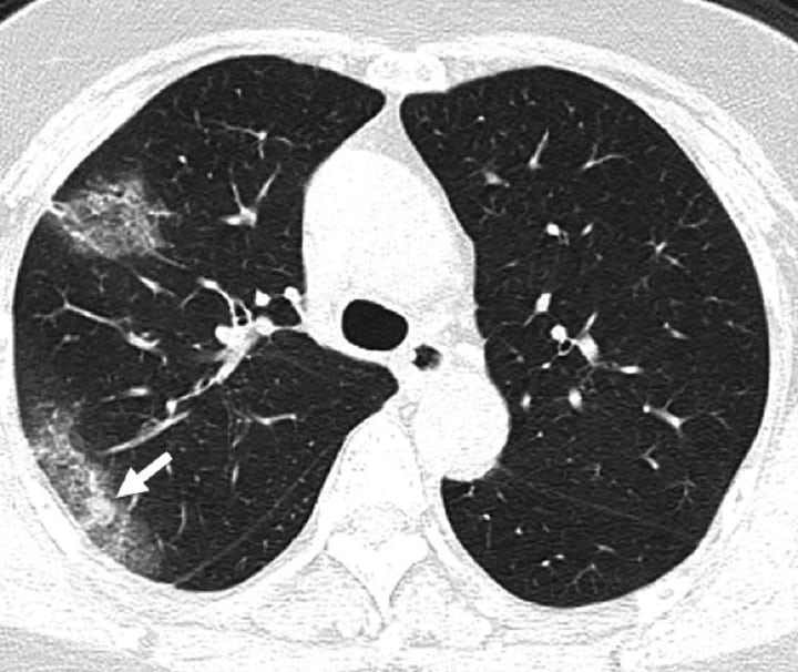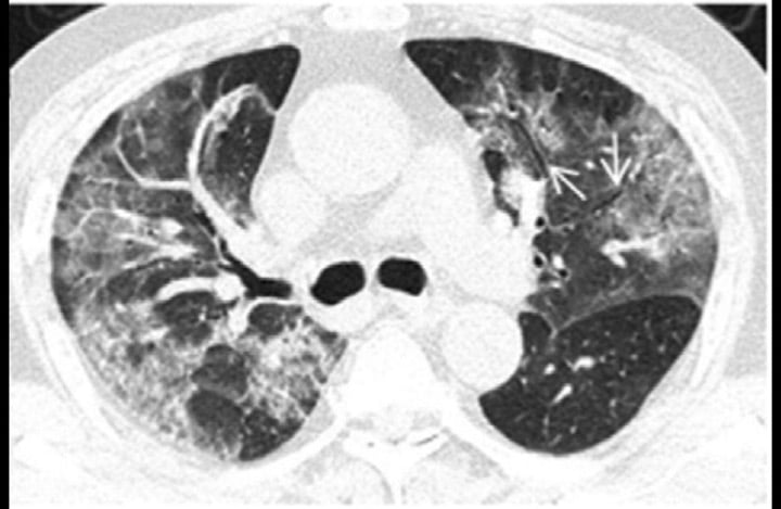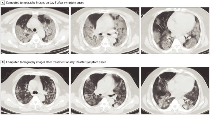 طبق یک مطالعه موردی، یک زن ۳۳ ساله با تب و سرفه پنج روزه، دمای بدن ۳۸.۸ درجه، مشکل تنفسی و تعداد پایین گلبولهای سفید خون، نشانهای از عفونت، به بیمارستانی در لانژو چین مراجعه کرد.در سی تی اسکن اولیه، محققان بیمارستان دانشگاه لانژو «کدورت شیشه مات» را در گوشه پایین ریههای وی شناسایی کردند.به این بیمار اینترفرون، پروتئینی برای درمان عفونتهای ویروسی، تجویز شد اما سه روز بعد (و بعد از درمان او) علائم بارزتر شدند. همین اتفاق در بیماران SARS نیز رخ داده است. «اگر از این شیوع اطلاع نداشتیم با مشاهده اسکن تشخیص پنومونی میدادیم، زیرا این شایع ترین چیزی است که میبینیم.»«ذات الریه معمولاً به سرعت پیشرفت نمیکند»، بنابراین این مورد منتفی است.اسکن ریه کرونایی یک خانم ۲۷ ساله که در ووهان کار میکرد، یک «هاله شیشه مات» را نشان داد؛ لکههای سفیدی که ندول کوچکی را احاطه کردهاند.